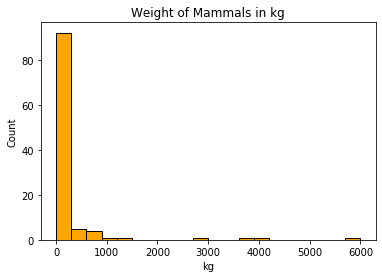 plt.hist(mammals.weight, bins=20, color='orange', edgecolor='black')