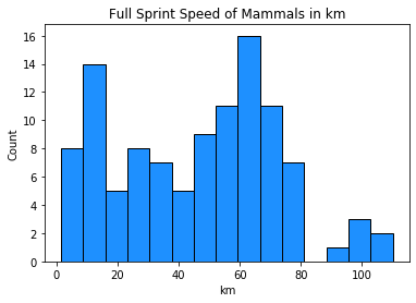plt.hist(mammals.speed, bins=15, color='dodgerblue', edgecolor='black')